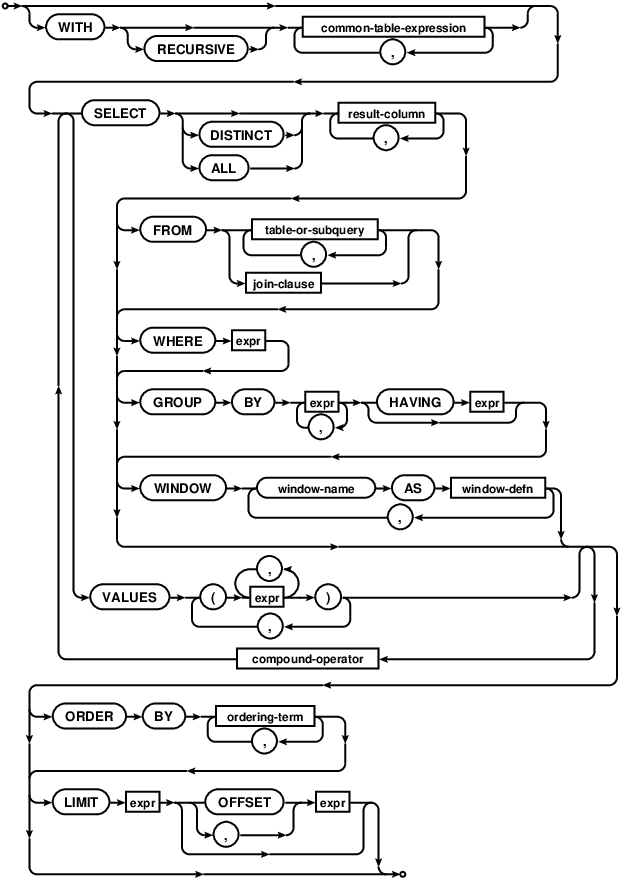 As an example, you are certainly familiar with a SELECT statement. In its basic format, like SELECT name FROM customers WHERE id = 1 it is quite easy to parse. However, the complete statement can be fairly complex. This image represents the SELECT statement as implemented in SQLite.